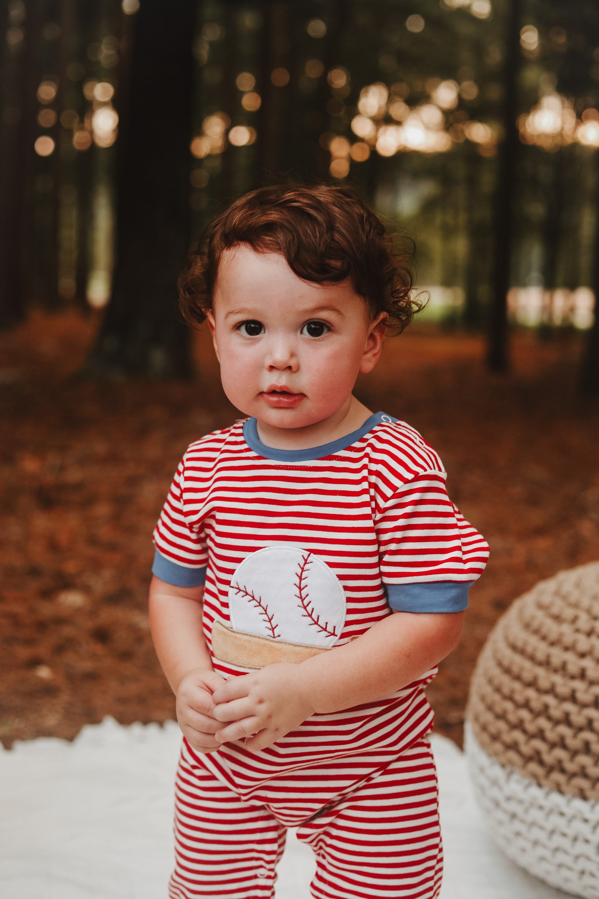 Make a classic and cute statement with this Baseball Applique Boys Romper! Perfect for those with an enthusiasm for sports, this romper features a baseball applique and is sure to be a hit with little ones. Get your little one ready for the game!