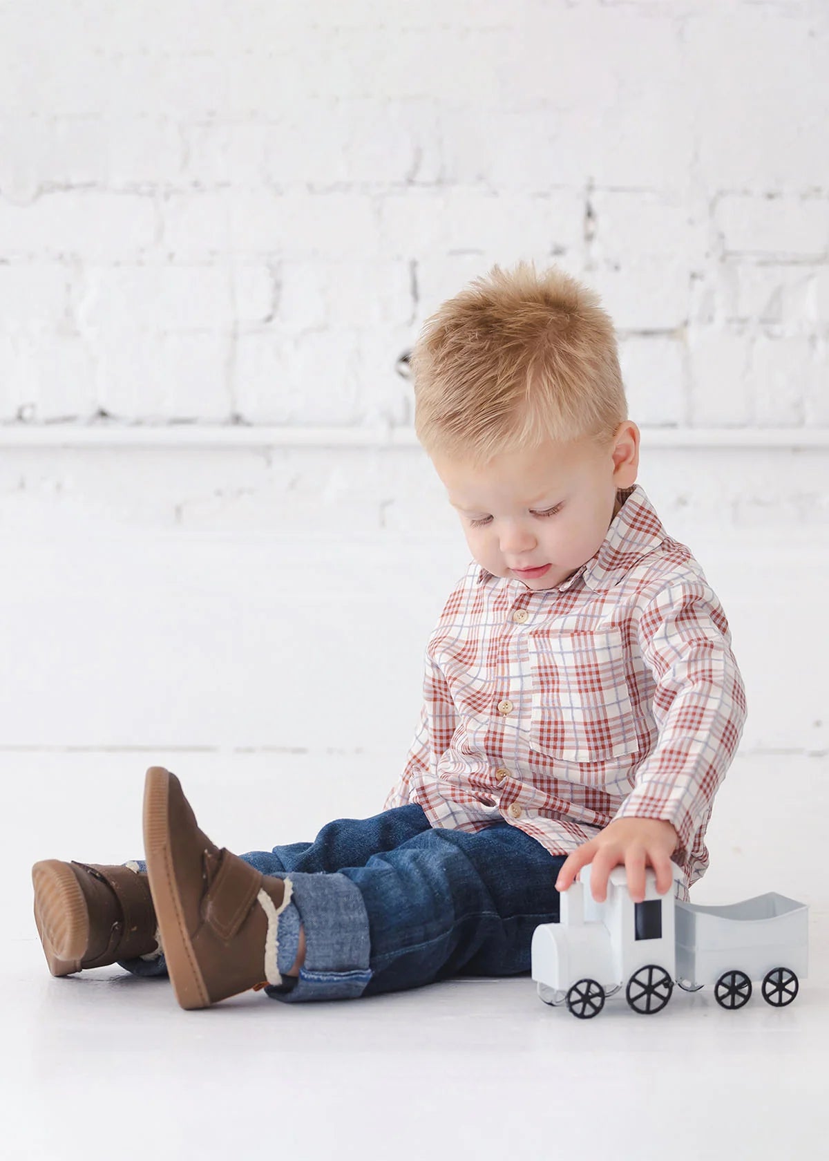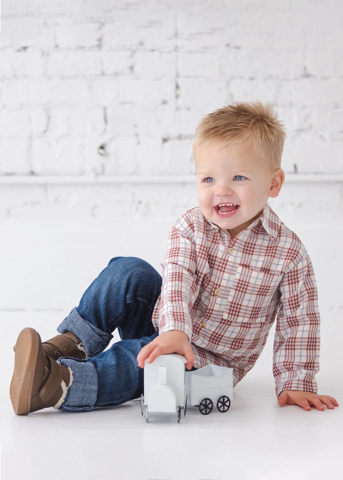 Our Rayon Long Sleeve Top is the ideal piece for your little one's fall and winter wardrobe. This cozy, cotton top showcases a button-down design, collar, and single chest pocket, decked out in a stylish plaid pattern!
