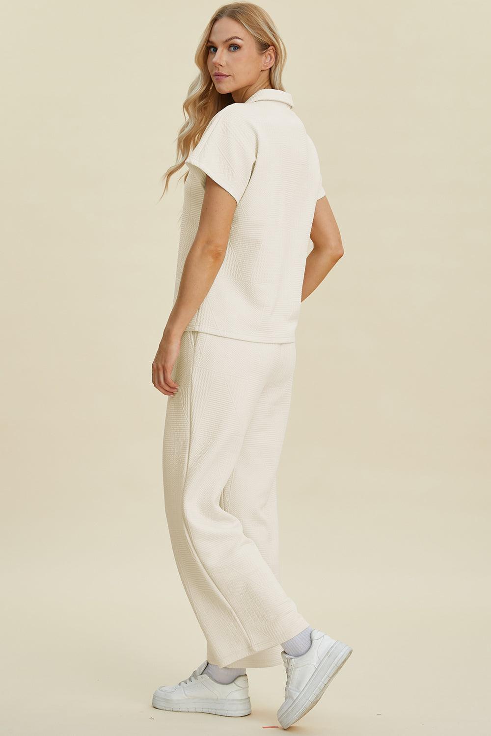 Double Take Full Size Collared Neck Short Sleeve Top and Pants Set