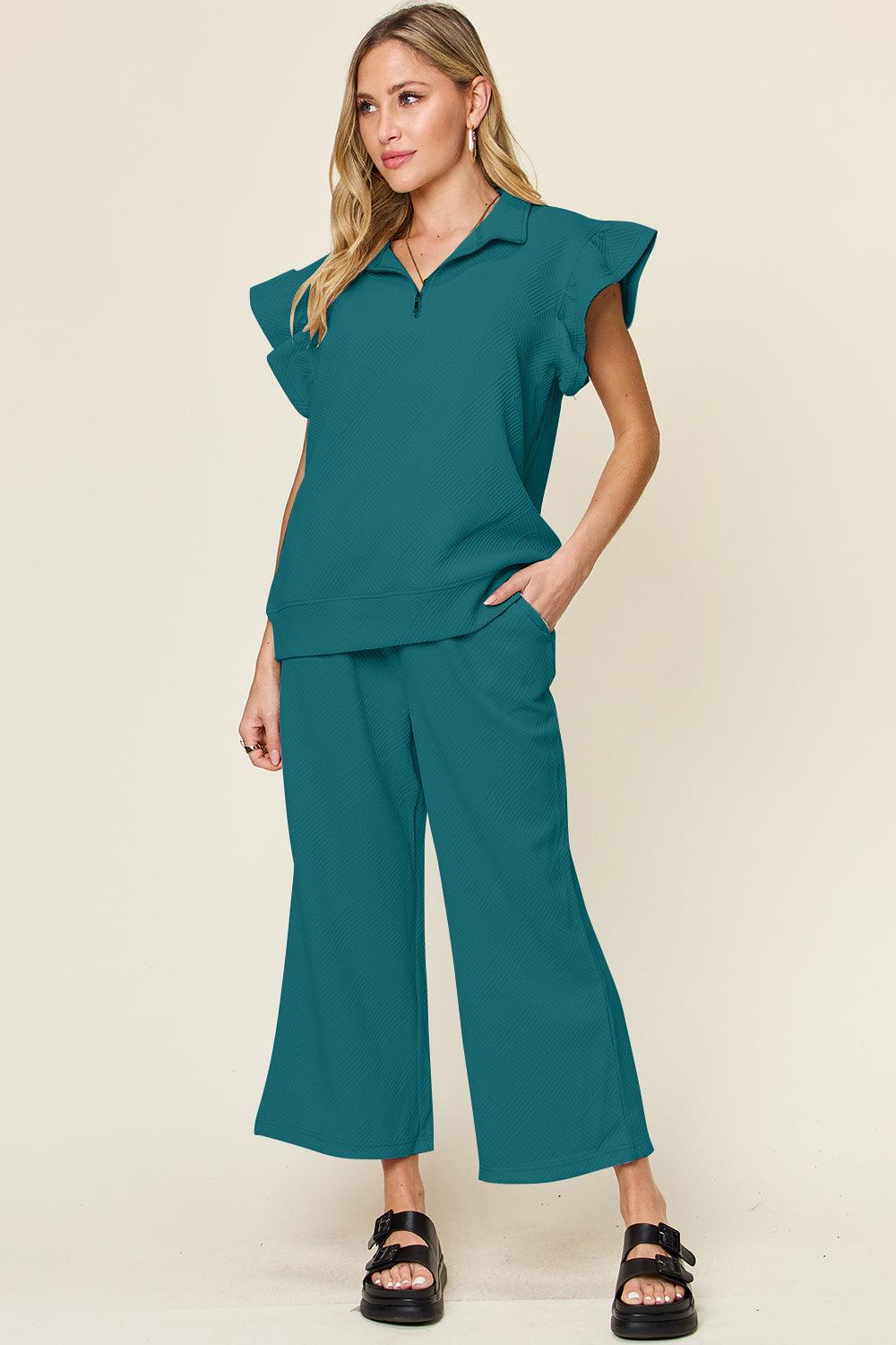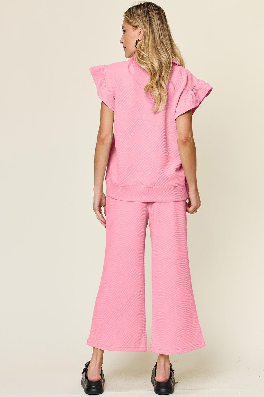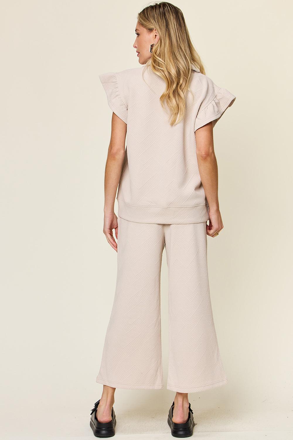Double Take Texture Ruffle Short Sleeve Top and Drawstring Wide Leg Pants Set