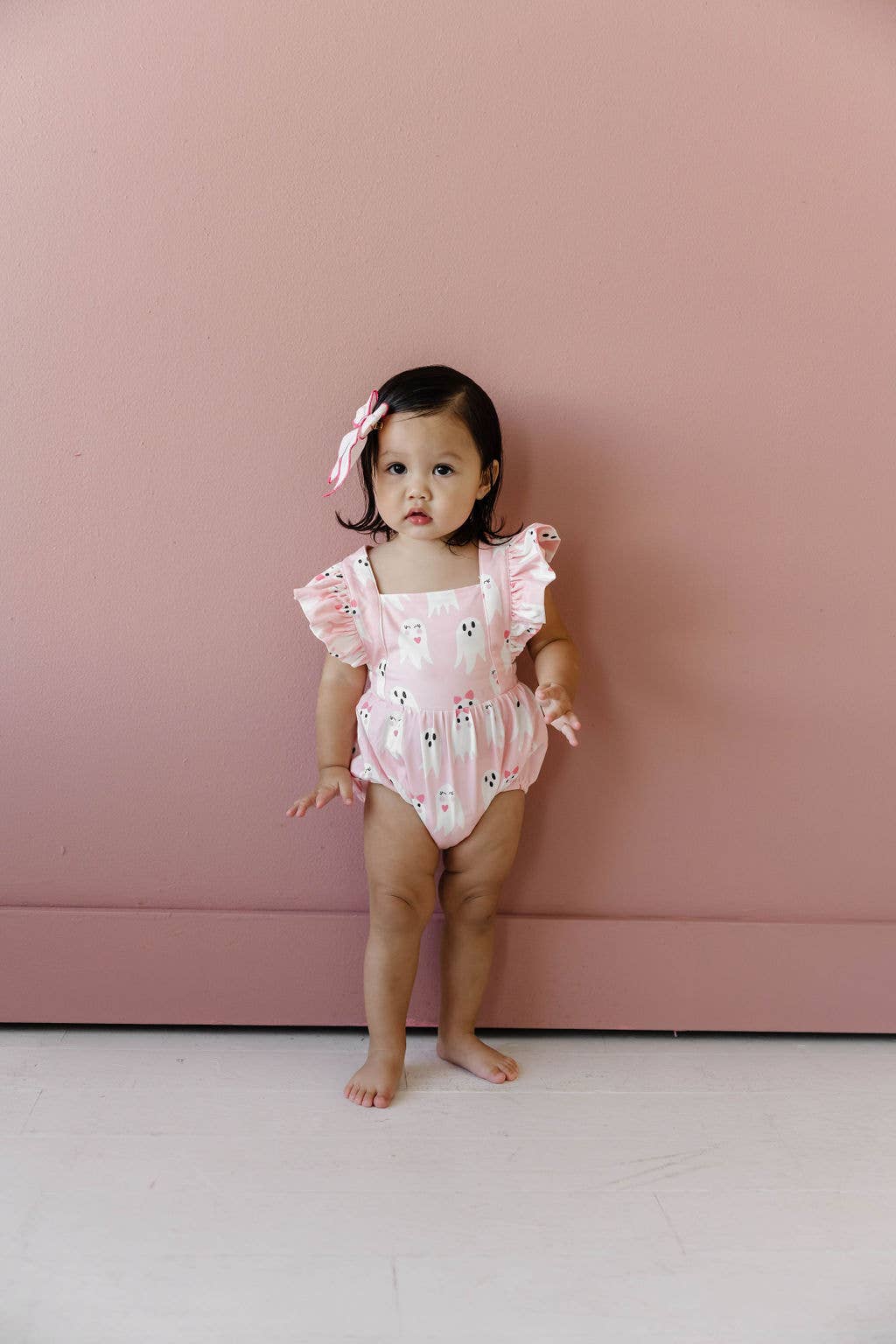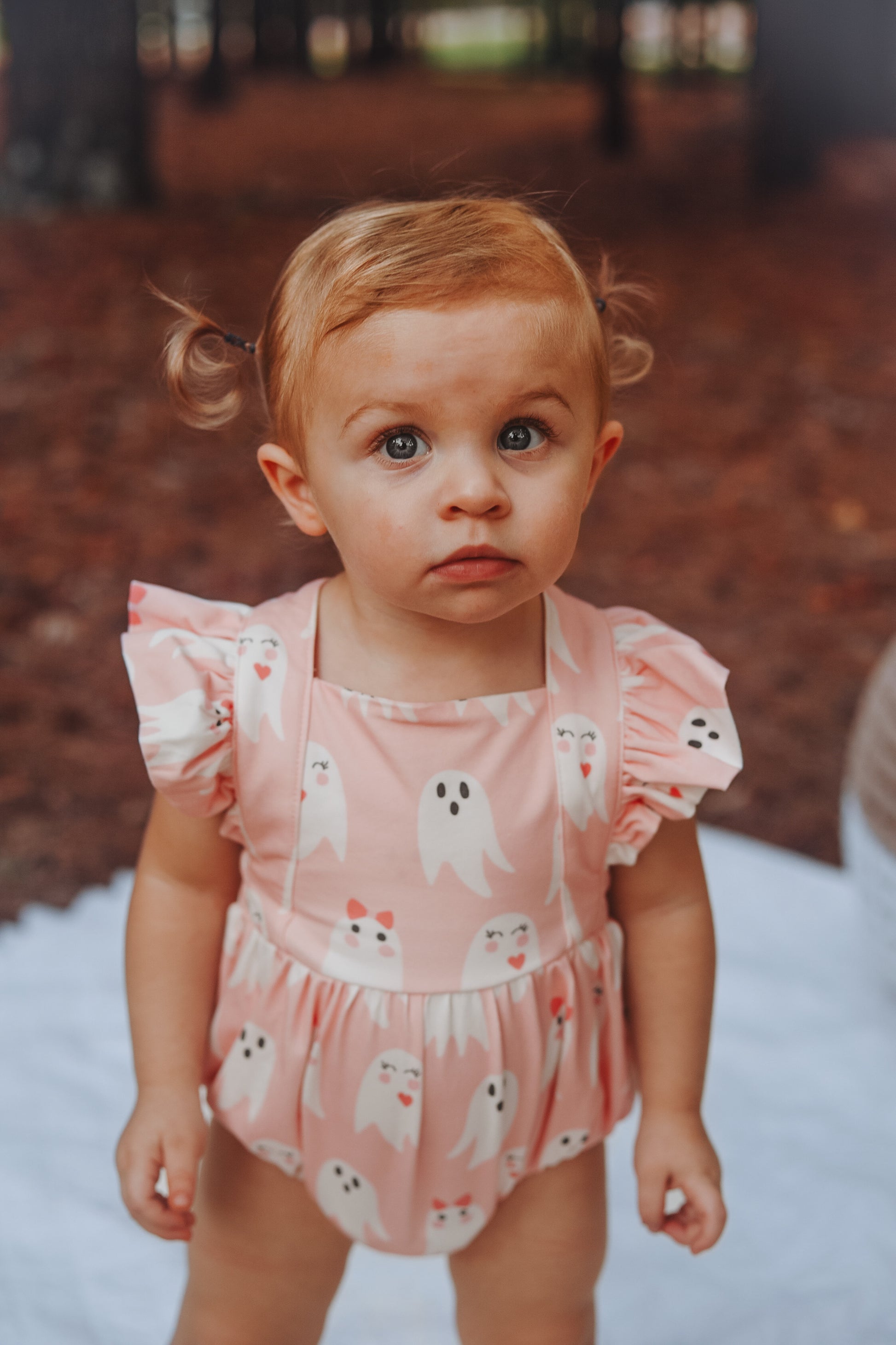 Featuring ruffled details along the shoulders and down the back, as well as adjustable straps for growing babes.