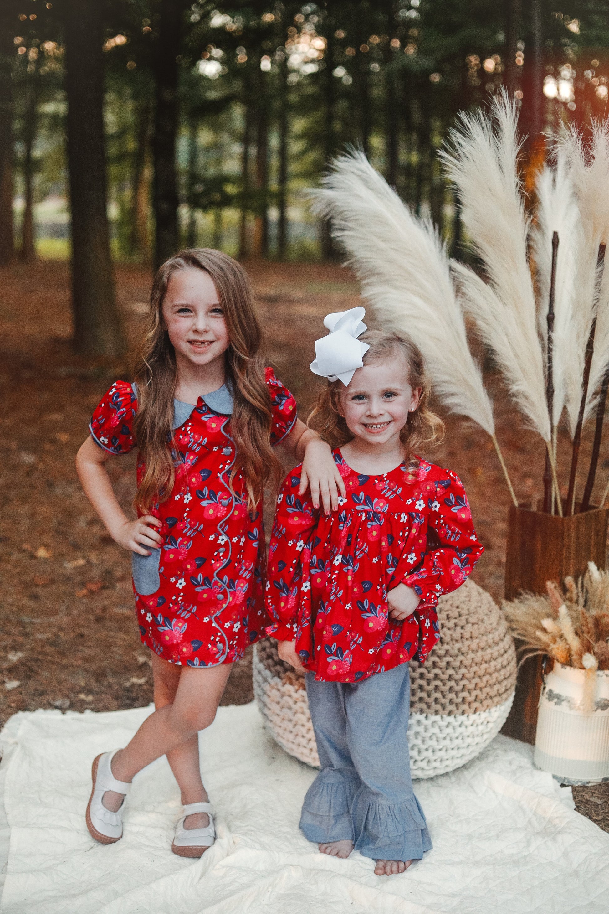 This adorable girls' Floral & Chambray Ruffle Pant Set will bring out her inner beauty! With a gorgeous floral pattern and a comfortable chambray fabric, she'll be feeling chic and confident all day long. A perfect addition to any wardrobe!