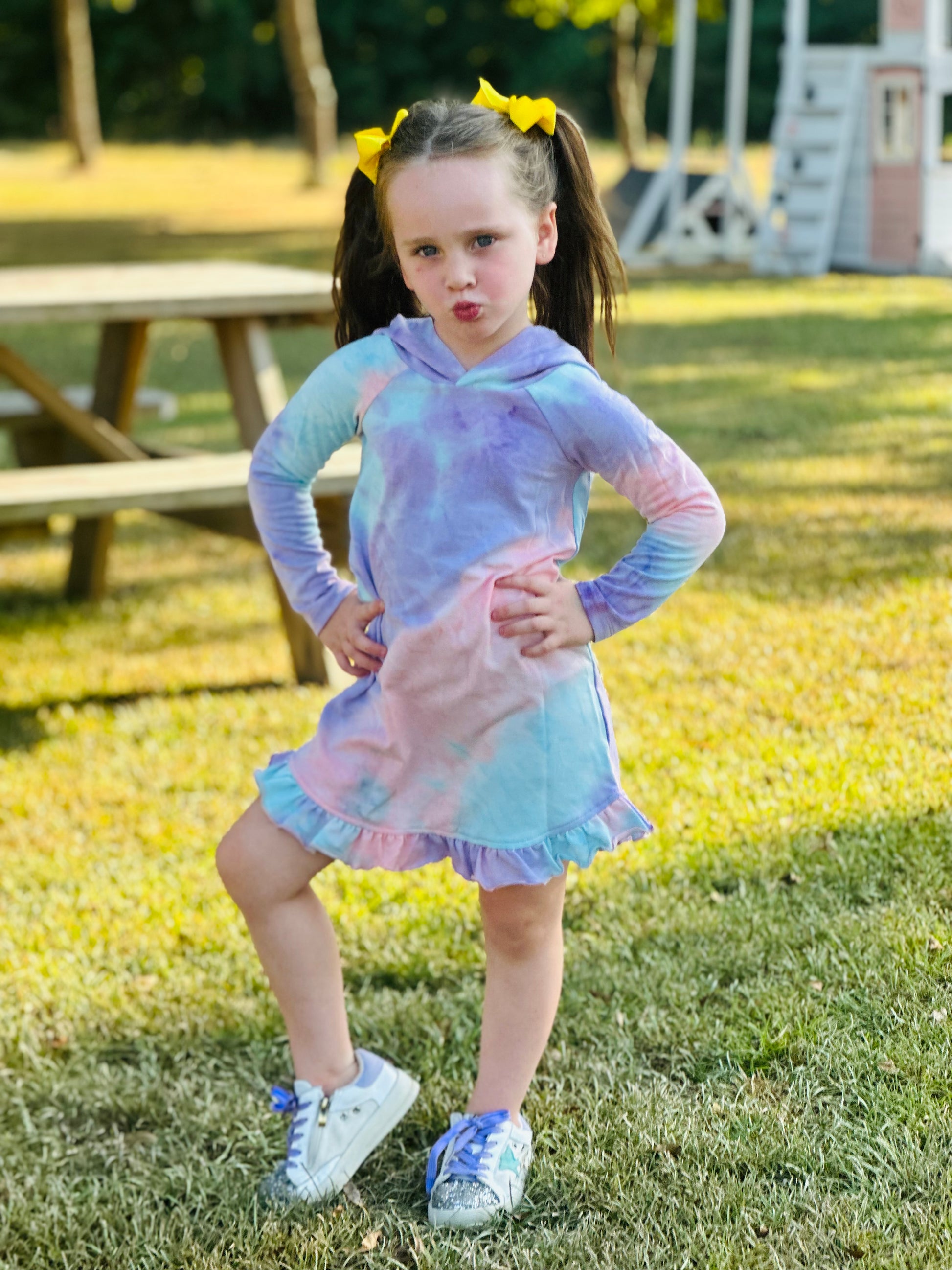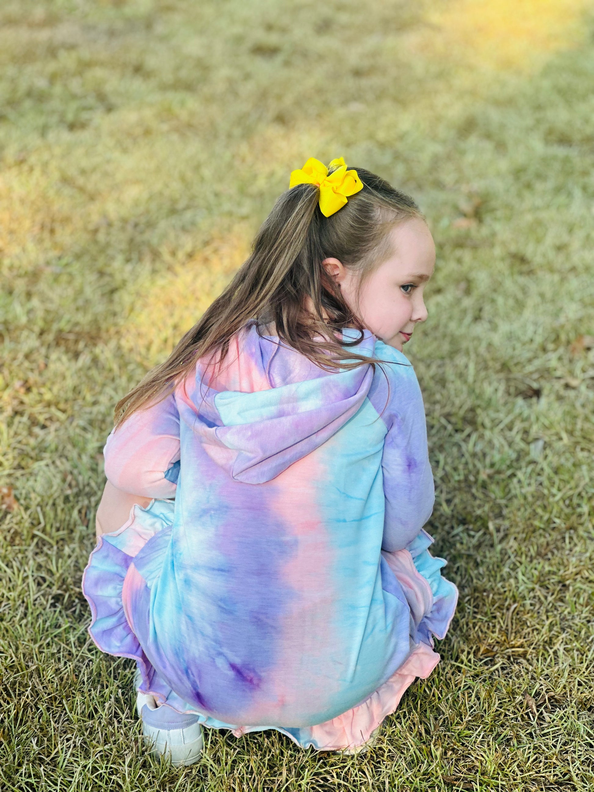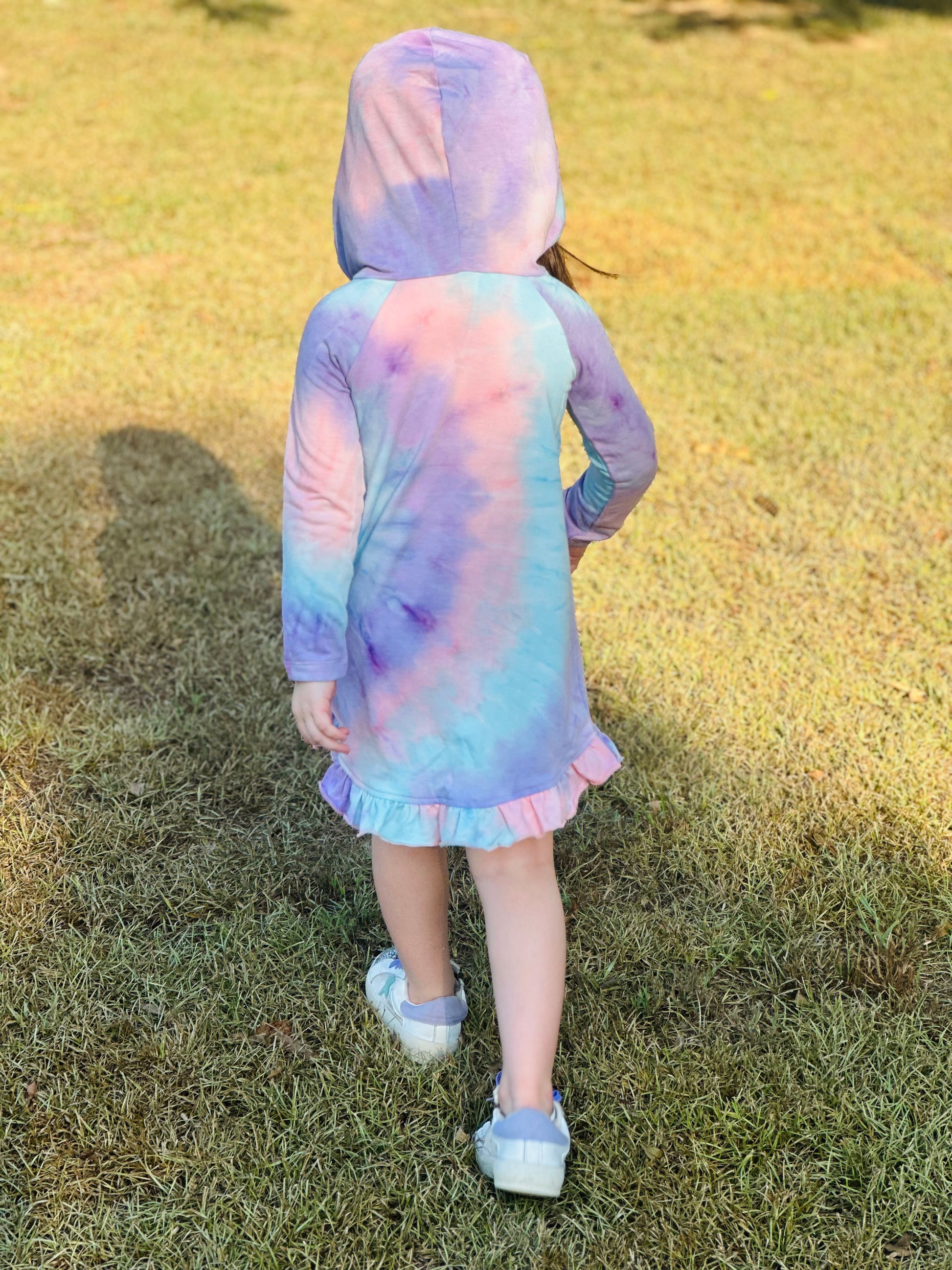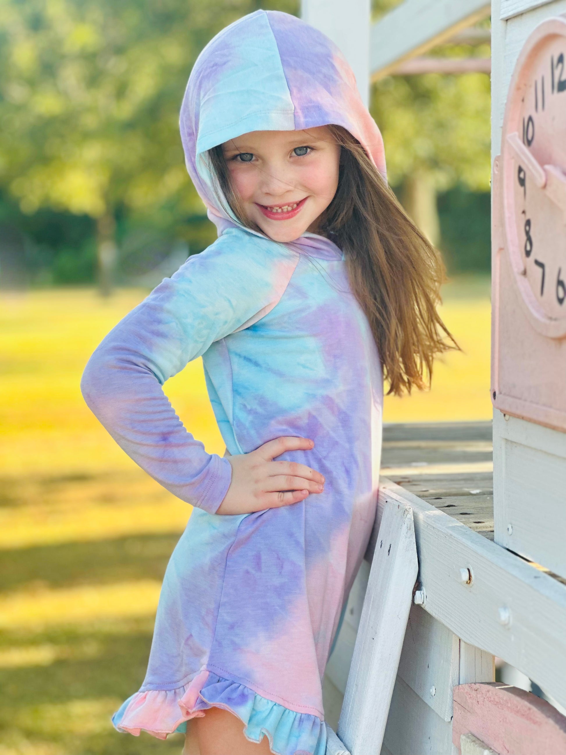 Make her daydream come true with this adorably fun Lollipop Daydream Knit Dress with Hoodie! Perfect for your little girl, the tie-dye print and hood detail makes it her new favorite. She won't want to take it off!