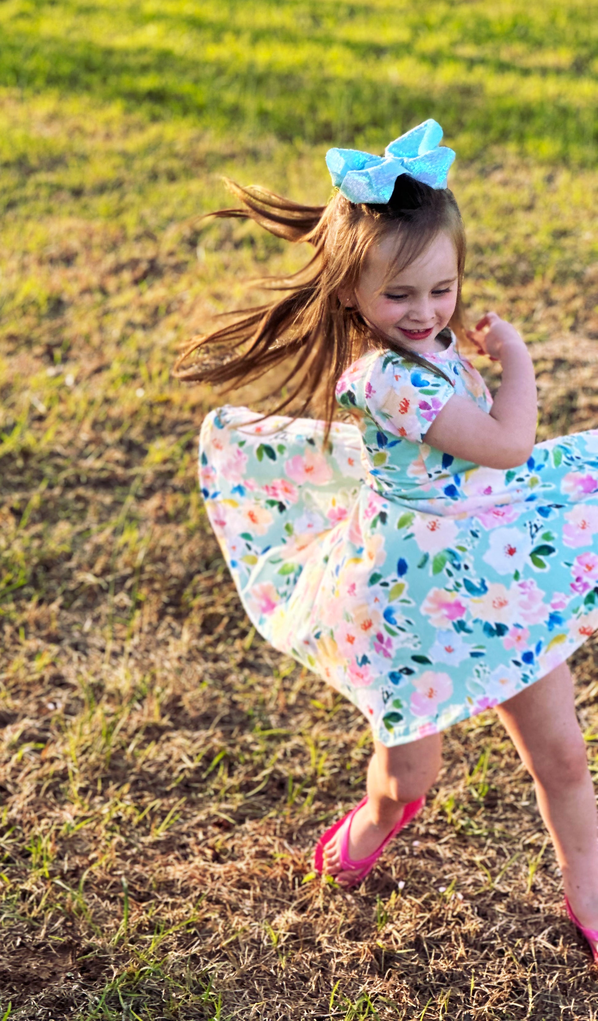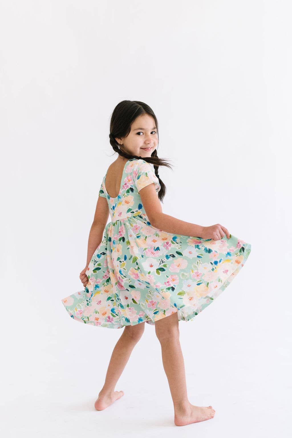 A classic ballet inspired twirl dress in our signature extra soft and stretchy fabric with side seam pockets, double lined bodice, scoop back and a full circle skirt for maximum twirls! Featuring our Watercolor Floral all over print