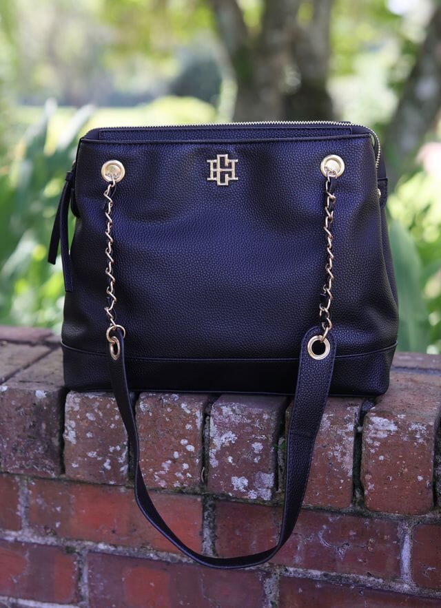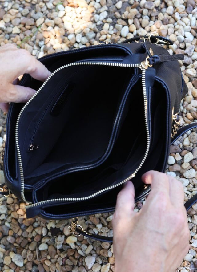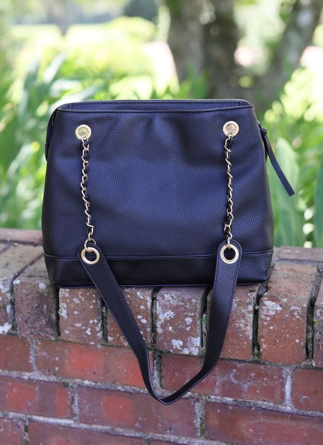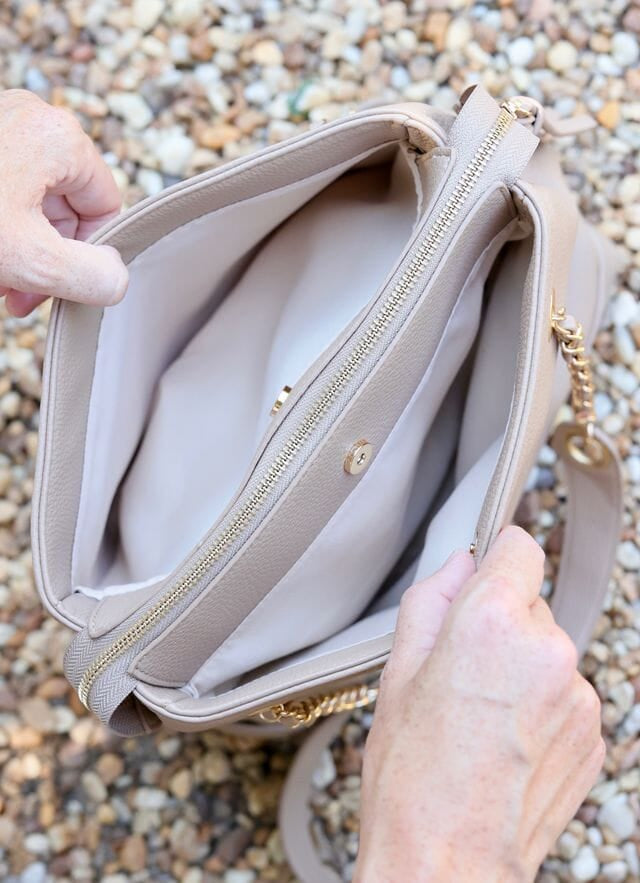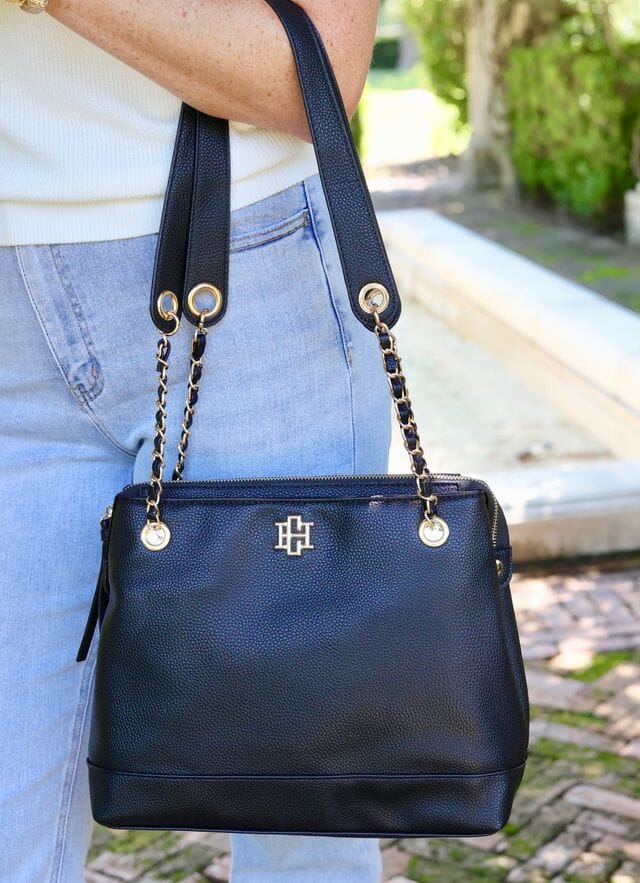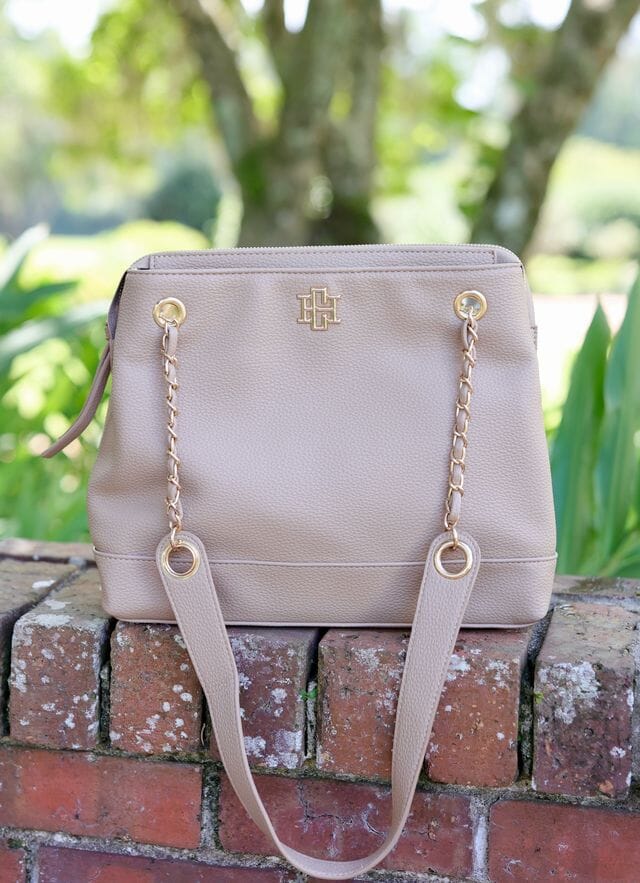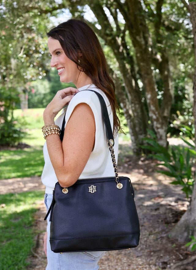 This everyday tote is the perfect go-to bag and is sure to keep you organized. It has large open sections on both sides of the bag with magnetic closures. It also has a top zipper leading to two additional large sections of the bag. Truly a place for everything! It is made with a soft, pebbled vegan leather material and features the Caroline Hill logo on one side. The elongated handles are so comfortable and have braided accents as well. There are also feet on the bottom of the bag for added protection.